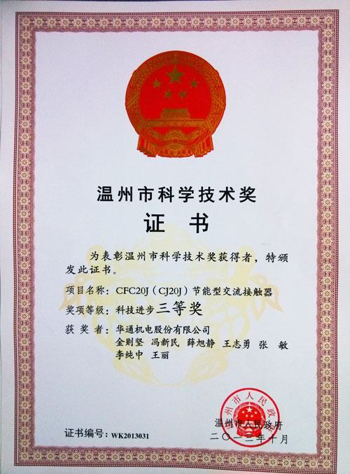 溫州市科技獎證書