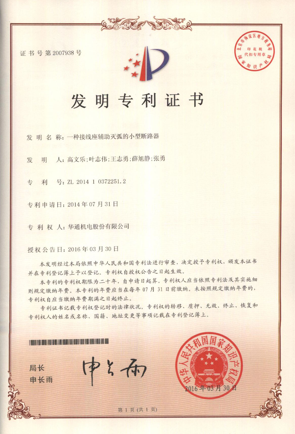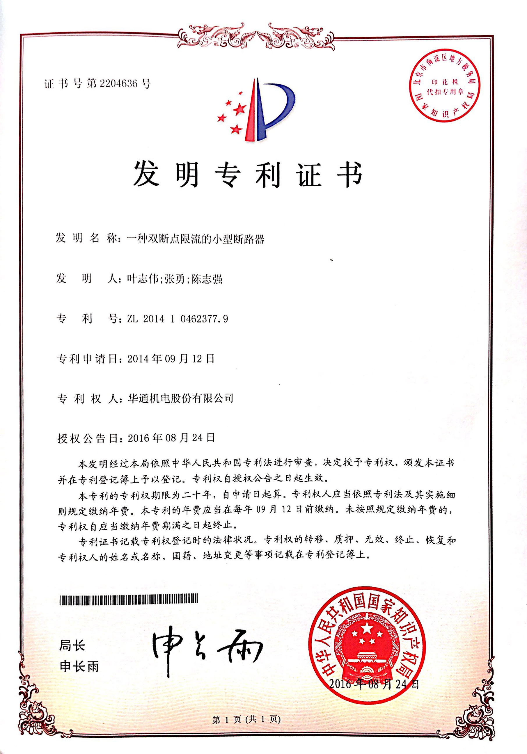 發(fā)明專利:一種雙斷點限流的小型斷路器