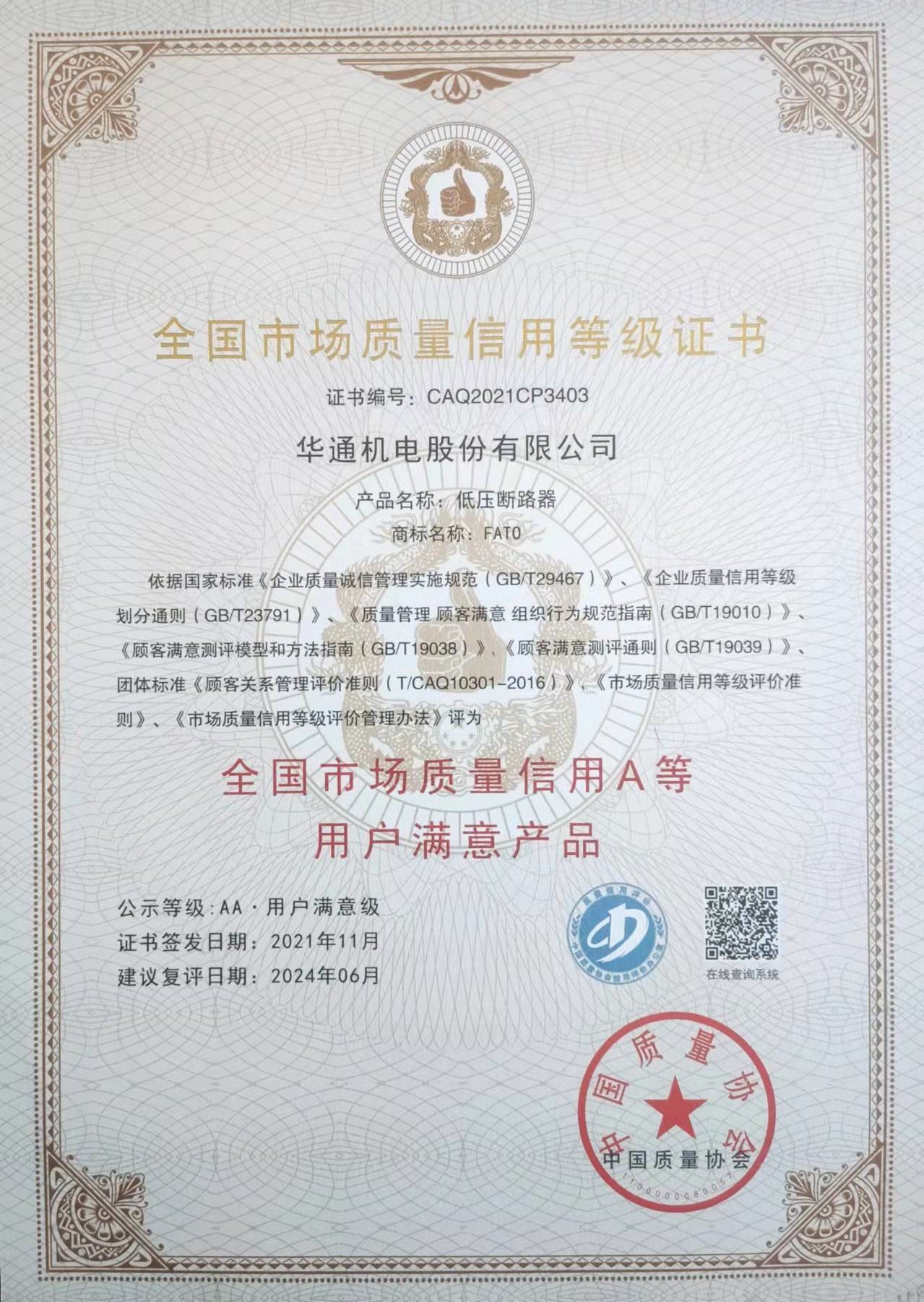 全國市場質(zhì)量信用等級證書